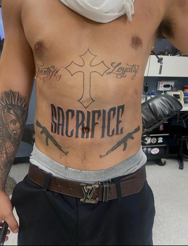 Izzy Tattoo Artist - Black N grey script stomach piece